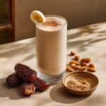 A creamy and naturally sweet Almond Banana Date Smoothie blending frozen banana, almond milk, dates, and almond butter for a nutritious and energizing breakfast or snack option.