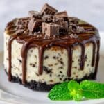 This decadent Andes Mint Cheesecake features a rich Oreo crust, creamy mint-infused filling studded with Andes chocolate pieces, and a luscious mint chocolate topping. Baked in a water bath for a smooth, creamy texture and finished with melted Andes mints for a glossy finish, this cheesecake is a perfect combination of chocolate and refreshing mint flavors, ideal for special occasions or indulgent treats.