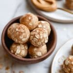 A close-up image shows a brown bowl filled with round energy balls. Each ball has a rough texture covered in light-colored oats and some brown powder sprinkled on top. The balls are beige with a slightly sticky look. In the background, on the white marbled surface, there is a white plate holding a wooden spoon with creamy peanut butter. Another white bowl with a few energy balls is partially visible below the main bowl. The colors are warm and natural with a soft light highlighting the textures, photo taken with an iphone --ar 4:5 --v 7
