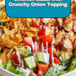 4. Top with Cheese and Onions: Sprinkle the shredded cheddar cheese and French fried onions over the entire salad to add richness and a crunchy finish.