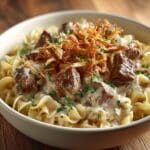 Beef Stroganoff is a classic Russian dish known for its creamy, savory sauce and tender strips of beef. This recipe combines sautéed mushrooms and onions with a rich sour cream gravy, making it a comforting meal perfect for any occasion.