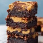 Three thick square brownies are stacked on top of each other on a white marbled surface. Each brownie has two main layers: the bottom layer is dark, rich, and fudgy chocolate with a moist texture, while the top layer has a creamy, light brown peanut butter swirl that creates an uneven patchy pattern. The edges of the brownies look slightly crispy and firm, contrasting with the soft inside. The background is a soft blue, blurred to keep the focus on the brownies. photo taken with an iphone --ar 4:5 --v 7
