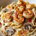 Blackened Shrimp Stroganoff is a flavorful and creamy pasta dish featuring juicy shrimp seasoned with Cajun spices, sautéed mushrooms and shallots, and a rich sour cream sauce enhanced with roasted red bell peppers and capers. Served over perfectly cooked fettuccini, this recipe combines bold spices with comforting textures for a quick and satisfying meal.