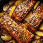 This Bourbon Peach Roasted Salmon recipe offers a delightful balance of sweet and savory flavors. The peach bourbon marinade lends a fruity glaze while fresh peaches roasted alongside the salmon add a juicy, tender touch. It’s an elegant yet simple dish perfect for a special dinner or a tasty weeknight treat.