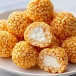 The image shows a pile of small round balls with a crispy outer layer made of golden puffed rice, giving a textured and crunchy look. One ball is cut open in the front, revealing a creamy white filling inside that looks soft and smooth. The balls sit on a white plate with slightly raised edges, placed on a surface with a white marbled texture. The lighting is soft and bright, highlighting the contrast between the crunchy outside and creamy inside of the balls. Photo taken with an iphone --ar 4:5 --v 7