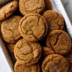 A close-up top view of a white rectangular tray filled with about ten round ginger cookies. Each cookie has a warm brown color with fine sugar dusting on top, showing cracked, slightly rough texture with soft edges. The cookies are stacked with some overlapping, creating a cozy, inviting look. The tray sits on a white marbled surface. photo taken with an iphone --ar 4:5 --v 7