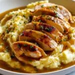 - Serve the Dish: Place a generous scoop of cheesy mashed potatoes on each plate. Top with sliced chicken breast and ladle the hot garlic gravy over the top. Sprinkle with fresh parsley or chives for a fresh vibrant finish, then serve immediately.