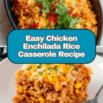This Chicken Enchilada Rice Casserole is a deliciously simple and comforting dish combining shredded chicken, cooked rice, black beans, corn, and enchilada sauce, layered with melted cheddar and Monterey Jack cheeses. Perfect for a family dinner, it bakes into a cheesy, flavorful casserole that’s easy to prepare and full of Tex-Mex flair.