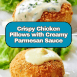 Deliciously crispy Chicken Pillows filled with a creamy chicken and cream cheese mixture, coated in buttery breadcrumbs and baked to golden perfection, served with a rich and velvety homemade Creamy Parmesan Sauce. A perfect appetizer or comforting main dish that combines flaky crescent rolls with savory filling and a luscious sauce.