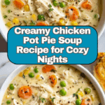 This comforting Chicken Pot Pie Soup combines the hearty flavors of classic chicken pot pie in a warm, creamy, and easy-to-make soup. Featuring tender shredded chicken, carrots, celery, potatoes, peas, and corn in a savory broth thickened with flour and enriched with cream, it’s a perfect meal for chilly days or anytime you crave a cozy bowl of soup.