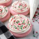 These festive Christmas Pink Velvet Cookies are soft, tender, and full of holiday cheer. Featuring a delicate pink hue and a flavorful cake batter base, these cookies are topped with creamy cream cheese frosting and colorful Christmas sprinkles, making them the perfect treat to brighten up your holiday celebrations.