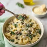 Store leftovers in an airtight container in the fridge for up to 4 days. The pasta will absorb sauce, so add a splash of broth or cream when reheating to restore creaminess. Freeze in a freezer-safe container for up to 2 months; sauces may separate slightly but can be reblended with stirring. Reheat gently on the stovetop or microwave, stirring occasionally.