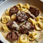 Keywords: steak tortellini recipe, garlic cream sauce, quick creamy pasta, cheese tortellini with steak, easy stovetop pasta dish