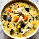 A white bowl filled with creamy chicken soup that has about three visible layers; the creamy yellow broth forms the base layer, mixed with small pieces of shredded white chicken on the second layer. The third layer consists of visible chunks of orange carrot, yellow corn, dark purple eggplant, and green herbs on top, with scattered small green leaf garnishes floating throughout. The background is a white marbled texture. Photo taken with an iphone --ar 4:5 --v 7