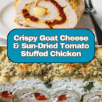 This Crispy Chicken with Goat Cheese & Sun Dried Tomatoes recipe features tender, pounded chicken breasts rolled around a creamy goat cheese and sun dried tomato filling, topped with a crunchy panko mixture and baked to golden perfection. The blend of tangy goat cheese, savory sun dried tomatoes, and aromatic basil creates a deliciously rich and textured dish perfect for an elegant weeknight dinner or special occasion.
