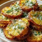 Crispy Garlic Herb Roasted Potato Skins are a delicious and flavorful appetizer or snack featuring russet potatoes baked to tender perfection, scooped out, and roasted with a fragrant mixture of garlic, rosemary, thyme, paprika, and olive oil. Finished with optional Parmesan cheese and fresh parsley, these crispy potato skins offer a perfect balance of crispy edges and herby goodness.