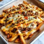 Dirty Fries are a deliciously loaded twist on classic fries, featuring crispy baked or air-fried potatoes smothered with melted cheddar and mozzarella cheese, sautéed onions and bell peppers, jalapeños, and a creamy, flavorful sauce. This hearty snack or appetizer combines bold spices, savory toppings, and a zesty drizzle, perfect for game days or casual gatherings.