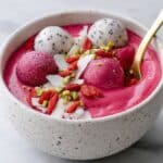 This vibrant Dragonfruit Smoothie Bowl combines frozen tropical fruits like dragonfruit, mango, and banana with a hint of ginger and lime juice, protein powder, and Greek yogurt for a nutritious and refreshing breakfast or snack. Topped with an assortment of crunchy and flavorful toppings such as toasted pistachios, dried coconut flakes, and puffed quinoa, it offers a delicious balance of creamy, sweet, and tangy flavors along with a satisfying texture.