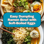 Keywords: dumpling ramen bowl, instant ramen, dumplings, soft-boiled eggs, chicken broth soup, Asian soup, quick ramen recipe, homemade ramen