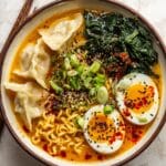 Keywords: dumpling ramen bowl, instant ramen, dumplings, soft-boiled eggs, chicken broth soup, Asian soup, quick ramen recipe, homemade ramen