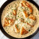 This Easy Cream Cheese Chicken recipe features tender chicken breasts cooked to golden perfection in a flavorful creamy sauce made from softened cream cheese, garlic, onions, and aromatic seasonings. Perfect for a quick weeknight dinner, this dish combines a rich, smooth texture with a mild kick from crushed red pepper flakes, all brought together in a simple skillet preparation.
