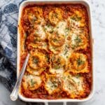 Keywords: tomato spinach ravioli bake, easy baked ravioli recipe, Italian pasta bake, spinach and cheese ravioli casserole