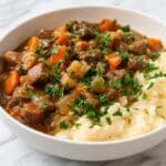 Fall Apple Cider Stew Mash is a comforting, hearty dish perfect for chilly days. Tender beef braised in sweet apple cider is served over creamy cheddar mashed potatoes, creating a flavor-packed meal the whole family will love.
