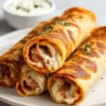 The image shows three rolled tortillas placed closely together on a white plate. The tortillas have a golden-brown toasted look with some crisp spots. Inside each roll, layers of melted cheese, red sauce, and small pieces of cooked meat are visible. The rolls are topped with chopped green herbs. In the background, there is a small white bowl filled with a white creamy sauce, sitting on a white marbled surface. Photo taken with an iphone --ar 4:5 --v 7