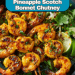 Keywords: Grilled prawns, burnt pineapple chutney, scotch bonnet chutney, barbecue seafood, smoky shrimp recipe, tropical chutney