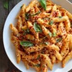 A vibrant and spicy Harissa Chickpea Pasta that combines al dente pasta with flavorful sautéed chickpeas tossed in a zesty harissa sauce, garlic, and fresh lemon juice, garnished with parsley for a fresh finish. This easy, protein-packed dish brings bold North African flavors to your weeknight dinner table.