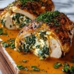 Herbed Ricotta Stuffed Chicken Rolls are tender, juicy chicken breasts filled with a creamy mixture of ricotta, Parmesan, fresh spinach, and herbs. Seared for a golden crust and baked in rich marinara sauce, these stuffed chicken rolls offer a flavorful and elegant meal perfect for family dinners or special occasions.