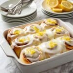 - Glaze and Garnish: While the rolls are still warm in the baking dish, drizzle the lemon cream cheese glaze evenly over the top. Garnish with fresh lemon slices and additional lemon zest for a fresh finish.