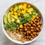 6. Serve: Spoon a base of tofu rice into serving bowls, top with the fresh mango avocado salad, then scatter the crispy roasted chickpeas over the top. Garnish with extra fresh cilantro if desired and enjoy immediately.
