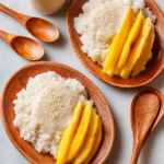 This classic Thai dessert, Mango Sticky Rice, features sweet glutinous rice cooked with coconut milk and sugar, perfectly paired with ripe mango slices and a rich coconut cream sauce. It’s a creamy, tropical treat that combines smooth, slightly sticky rice with juicy mango slices and a luscious coconut drizzle, optionally topped with toasted sesame seeds for an added nutty crunch.