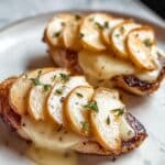 Two pieces of browned chicken sit on a white plate with a white marbled texture underneath. Each piece has a melted, creamy white cheese layer on top, covered by thin, golden-brown slices of cooked apple arranged neatly in a row. Tiny green herb leaves are sprinkled on the apple slices, adding a fresh touch. The chicken looks juicy with a shiny glaze and small black pepper specks visible. photo taken with an iphone --ar 4:5 --v 7