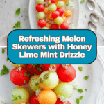 Keywords: melon skewers, fruit skewers, honey lime mint drizzle, summer appetizer, healthy snack, no-cook recipe