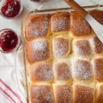 A glass baking dish contains twelve square bread rolls baked together, arranged in three rows and four columns. The rolls have a golden brown top crust with a slightly puffy and soft texture, dusted lightly with white powdered sugar. The edges of the dish show a darker, crispy crust. Nearby, two small white bowls hold a dark red jelly, and a metal spatula with a wooden handle rests on a white cloth with red stripes. The background surface is a white marbled texture. Photo taken with an iphone --ar 4:5 --v 7