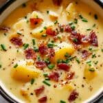 This creamy and comforting Outback Steakhouse-style potato soup features tender diced russet potatoes simmered in chicken broth and enriched with heavy cream, sour cream, and shredded cheddar cheese. Enhanced with flavorful bacon bits, garlic, and onion powder, this hearty soup is perfect for a cozy meal and garnished with green onions, extra cheese, and crispy bacon for the ultimate indulgence.