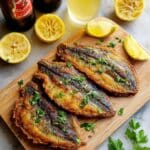 - Drain and Serve: Remove the sardines from the pan and place them on a paper towel-lined plate to absorb any excess oil. Arrange the sardines on a serving dish, garnish with chopped parsley, and serve immediately with fresh lemon wedges on the side.