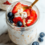 A nutritious and protein-packed overnight oats recipe featuring rolled oats, protein powder, chia seeds, and Greek yogurt, sweetened with maple syrup and flavored with vanilla. Perfect for a quick, healthy breakfast that can be enjoyed cold or warm with your choice of fresh berries, nut butter, and sugar-free chocolate chips as toppings.