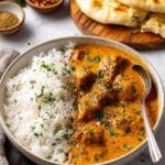 The image shows a bowl filled halfway with white fluffy rice and the other half with creamy orange curry containing chunks of meat, all sprinkled with chopped green herbs and black pepper. A silver spoon rests on the right side in the curry. In the background, there are pieces of naan bread on a wooden board and some small bowls of spices, all set on a white marbled surface. Photo taken with an iphone --ar 4:5 --v 7
