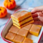 A woman's hand holds a square piece of cake with three visible layers: a thick bright orange sponge layer at the bottom, a thin darker brown layer in the middle that looks like a filling, and a thin, shiny, light beige glaze on top. The cake piece is raised above a white pan with a red rim, showing many similar square pieces still inside. In the blurred background, two small bright orange pumpkins are visible on a white marbled surface. Photo taken with an iphone --ar 4:5 --v 7