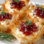 Keywords: mini phyllo shells, cream cheese appetizer, red pepper jelly bites, easy party snack, warm dips