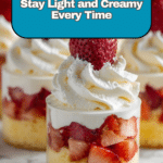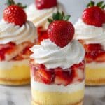 - Repeat layering: Continue layering cake, strawberries, and whipped cream until the serving cups are filled, finishing with a swirl of whipped cream on top.