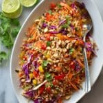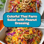 This vibrant Rainbow Thai Farro Salad is a refreshing, nutrient-packed dish featuring chewy farro, colorful bell peppers, crunchy cabbage, and a flavorful Thai-inspired peanut dressing. Perfect as a light lunch or a side dish, it combines wholesome grains with fresh vegetables and a zesty, creamy sauce with peanut butter, lime, and ginger for an irresistible flavor and texture balance.