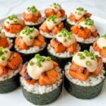 Salmon Sushi Cups are a delightful twist on traditional sushi, combining cooked seasoned rice and marinated salmon cubes baked inside crispy nori cups. This easy-to-make recipe features a flavorful blend of coconut aminos and spicy mayo, perfectly balanced with fresh chives for garnish. Ideal as a party appetizer or a fun, bite-sized meal, these sushi cups offer the delicious taste of sushi with a warm, crispy texture from baking.