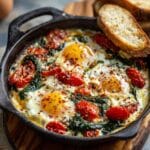 This skillet eggs recipe with garam masala and tomatoes is a flavorful twist on a classic breakfast dish. The fragrant spices combined with tender tomatoes create a rich sauce perfect for poaching eggs. It’s a comforting and vibrant meal that’s easy to prepare and sure to impress.