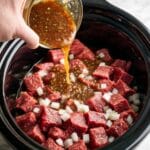 - For deeper flavor, brown the beef cubes in olive oil before adding them to the slow cooker.