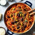 This Spicy Tomato One-Pan Pasta is a simple and flavorful Italian-inspired dish that combines dry linguine, olives, tomatoes, and a blend of aromatic spices cooked all in one pan. Perfect for a quick weeknight dinner, it offers a spicy kick from red pepper flakes balanced by the rich umami of Kalamata and garlic-stuffed olives, finished with freshly grated parmesan and a drizzle of olive oil.