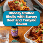 Stuffed Shells with Savory Beef Sauce is a comforting Italian-American dish featuring jumbo pasta shells filled with a creamy ricotta and mozzarella cheese mixture, baked in a flavorful savory beef sauce enhanced with Italian seasoning and a touch of roasted garlic teriyaki marinade. This hearty casserole offers a perfect balance of rich cheeses, tender ground beef, and aromatic herbs, making it ideal for family dinners or special occasions.